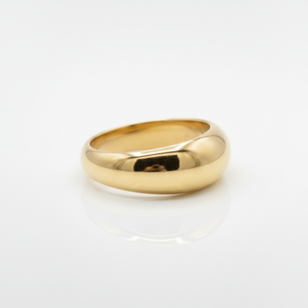 Cet anneau « Dôme Régulier » en or 10 carats incarne la force et l’élégance intemporelle. Plus épais que la version Thin Dôme, il présente une courbe bombée classique, parfaitement polie, qui capte la lumière avec intensité. Sa silhouette affirmée en fait une bague de caractère, idéale pour ceux qui recherchent une présence plus marquée au doigt.
