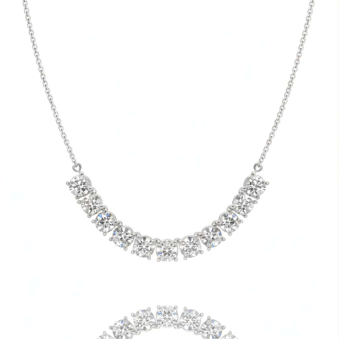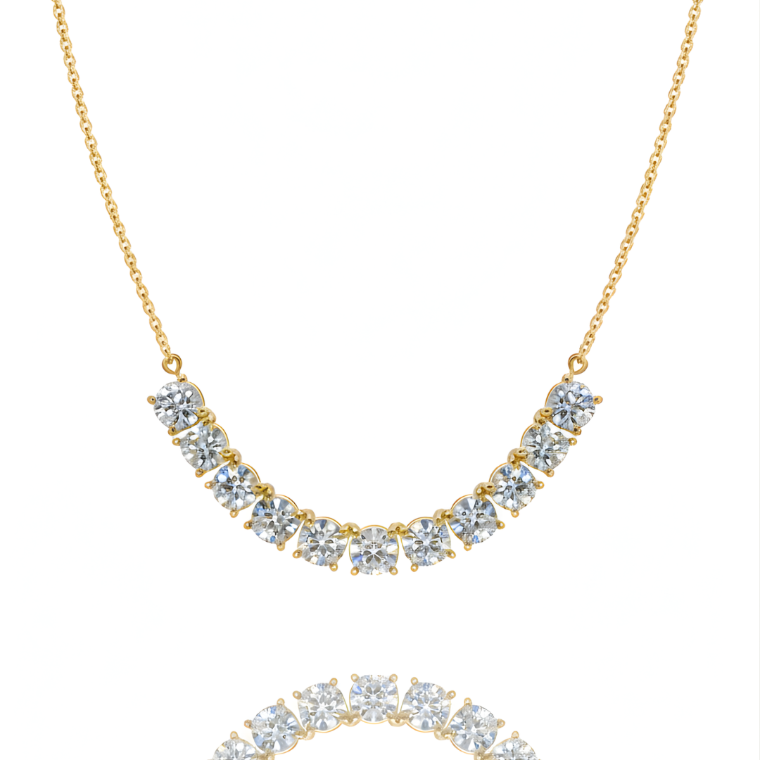 Ce collier présente une ligne délicatement incurvée de diamants ronds, parfaitement alignés pour épouser le décolleté avec élégance. Le sertissage fin et précis permet à chaque pierre de capter la lumière, offrant une brillance intense et homogène sous tous les angles.