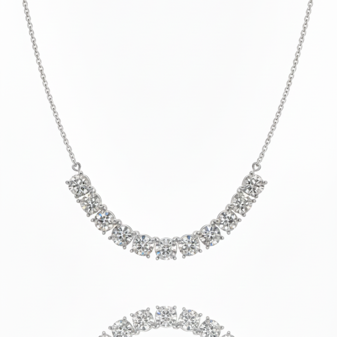 Ce collier se distingue par une composition élégante de diamants ronds sertis en ligne légèrement incurvée, créant un effet lumineux et harmonieux qui épouse parfaitement le décolleté. Chaque pierre est délicatement maintenue par un sertissage discret, laissant passer un maximum de lumière pour une brillance naturelle et continue.
